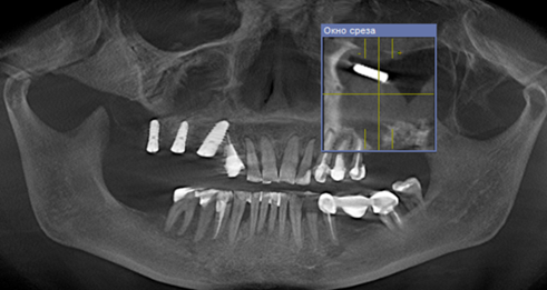 Fig. 1. Perforation of the bottom of the maxillary sinus on the right and pushing the implant