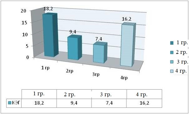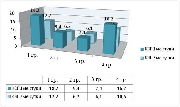 КЭГ | 12,2 ± 2,0 | 10,4 ± 1,8 | 9,4 ± 1,8 | 6,2 ± 1,4 |