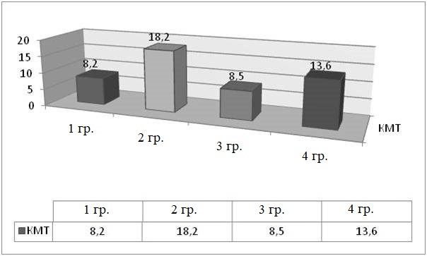 КМТ | 16,2 ± 1,8 | 13,2 ± 1,8 | 10,5 ± 1,4 | 10 ± 1,4 |
