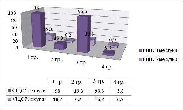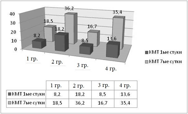 Во 2 и 4 группах КЗвЦС за 1-е сутки после получения травмы не превысил 10,2 и 10,4 соответственно, снижение локомоторной и общей активности обусловлено угнетением функциональной активности центральной нервной системы МЖ, что соответствовало данным клинических наблюдений.