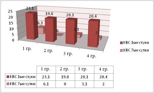 У животных 2 и 4 группы отрицательная динамика показателей КВС соответствовала типу перелома, объёму смещённых фрагментов, повреждённых соединительно-тканных структур, общемозговой симптоматике, регистрируемой после моделирования травмы (таблица 3, рисунок 3).