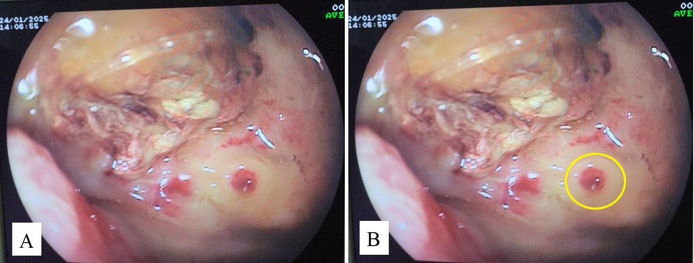 Fig. 2. Endoscopic photographs of the BGDU: A – before marking the pathological structures; B – after marking (a yellow oval highlights a thrombosed vessel in the bottom of the BGDU)