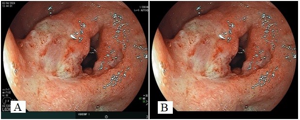 Рис. 3. Эндоскопические фотографии КГДЯ (FIIC): A – исходное изображение; B – после обработки с использованием генеративных диффузионных моделей Stable Diffusion