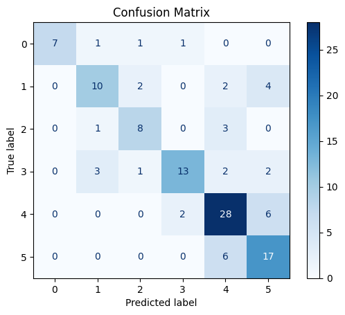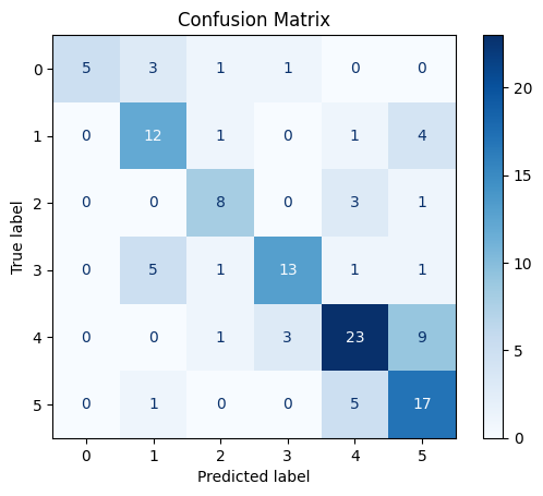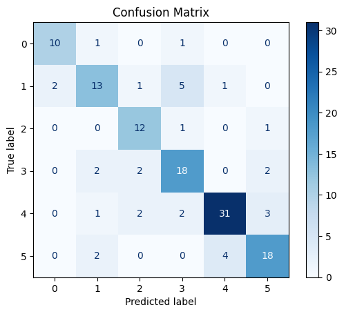 Рис. 5. Матрица ошибок на тестовых данных модели EfficentNetB0 классификации по 6 классам с предобработкой данных удалением без заморозки весов