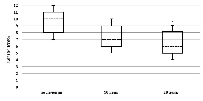Аналогичная динамика наблюдается с Lactobacteriumspp. (рисунок 2), концентрация которых уже на 10 день лечения уменьшилась на 28 % по сравнению с исходным уровнем