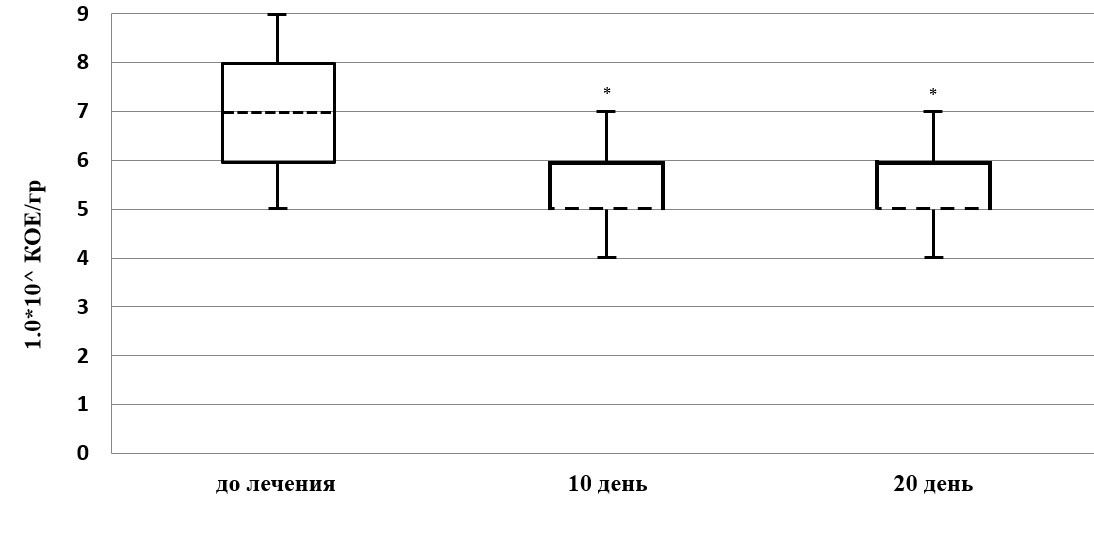 Примечание к рис. 1: КОЕ от 0 до 10 12/мл; * – (p ⩽ 0,05) достоверность отличий по отношению к показателям до лечения; [T] – максимальный показатель; [L] – минимальный показатель; [---] – средняя величина.