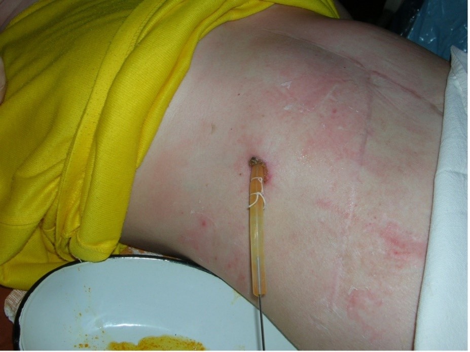 Рис. 3. То же наблюдение. Внешний вид чреспеченочного холангиостомического дренажа большого диаметра