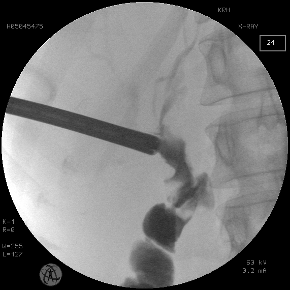 Поскольку стриктура БДА на фоне холелитиаза не носит полный характер, то ее антеградная баллонная дилатация не вызывает трудностей, в отличие от «чистой» бескаменной стриктуры, при которой с частотой до 25 % не удается пройти из желчного протока в отводящую петлю тонкой кишки.