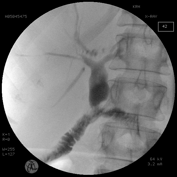 Fig. 1. Multiple megacholangiolithiasis proximal to the stricture of the BDA. Condition after percutaneous transhepatic cholangiostomy