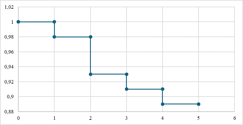 Fig. 7. Frequency of relapse-free course of disease according to Kaplan – Meier in patients after X-ray surgical treatment of stricture of the BDA with concomitant cholelithiasis (observation for 5 years)
