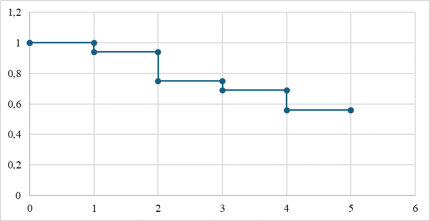 Показатели кумулятивной частоты безрецидивного течения при рентгенохирургической коррекции стриктуры БДА у пациентов без сопутствующего холелитиаза по Каплану – Мейеру представлены на рисунке 6.