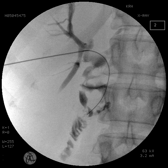 Fig. 8. Passage of the search guide through the BDA zone during primary puncture of the bile ducts