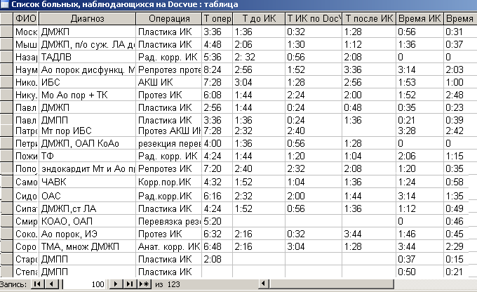 Рис. 1. Фрагмент базы данных больных, прооперированных в операционных № 8–12. Здесь: первый столбец – ФИО больного, второй – фрагмент диагноза, далее – название операции, Т – время этапа хирургического вмешательства. Например, Т опер. (4 столбик) – длительность операции в целом, Т до ИК (5 столбик) – время, прошедшее от поступления больного в операционную до начала искусственного кровообращения (ИК), и т. д.
