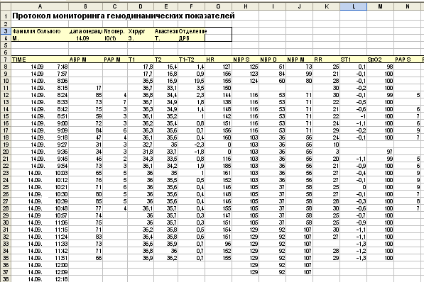 Рис. 2. Фрагмент компьютерного протокола сбора и хранения данных для больного. Здесь: первый столбец – номер строки, второй столбец – время и дата измерения (число, месяц, часы, минуты), далее: ABP M – среднее артериальное давление, PAP M – среднее давление в легочной артерии, Т1, Т2, Т1–Т2, – соответственно, ректальная, кожная температуры и их градиент, HR – частота сердечных сокращений; измеренное неинвазивно артериальное давление: систолическое – NBP S, диастолическое – NBP D, среднее – NBP M; RR – частота дыхания, ST1 – ST сегмент, SpO2 – пульсоксиметрия, легочное артериальное давление систолическое – PAP S