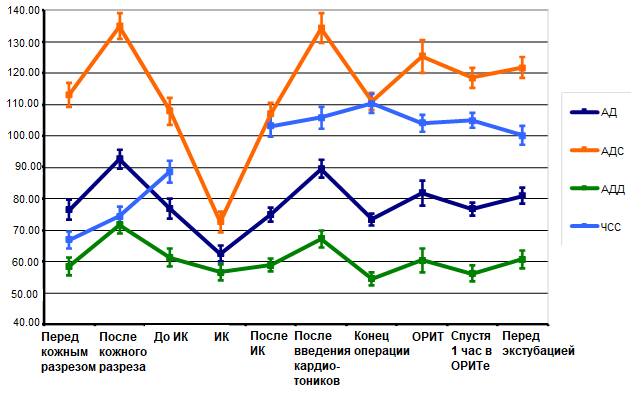 Данные гемодинамики каждого больного усреднялись по этапам и процедурам операции [Лищук, Газизова, 2016; Лищук и др., 2017]. Средние величины по каждому больному усреднялись по видам оперативного вмешательства, оперирующим хирургам, отделениям. Кроме того, данные обобщались за месяц, квартал и год.