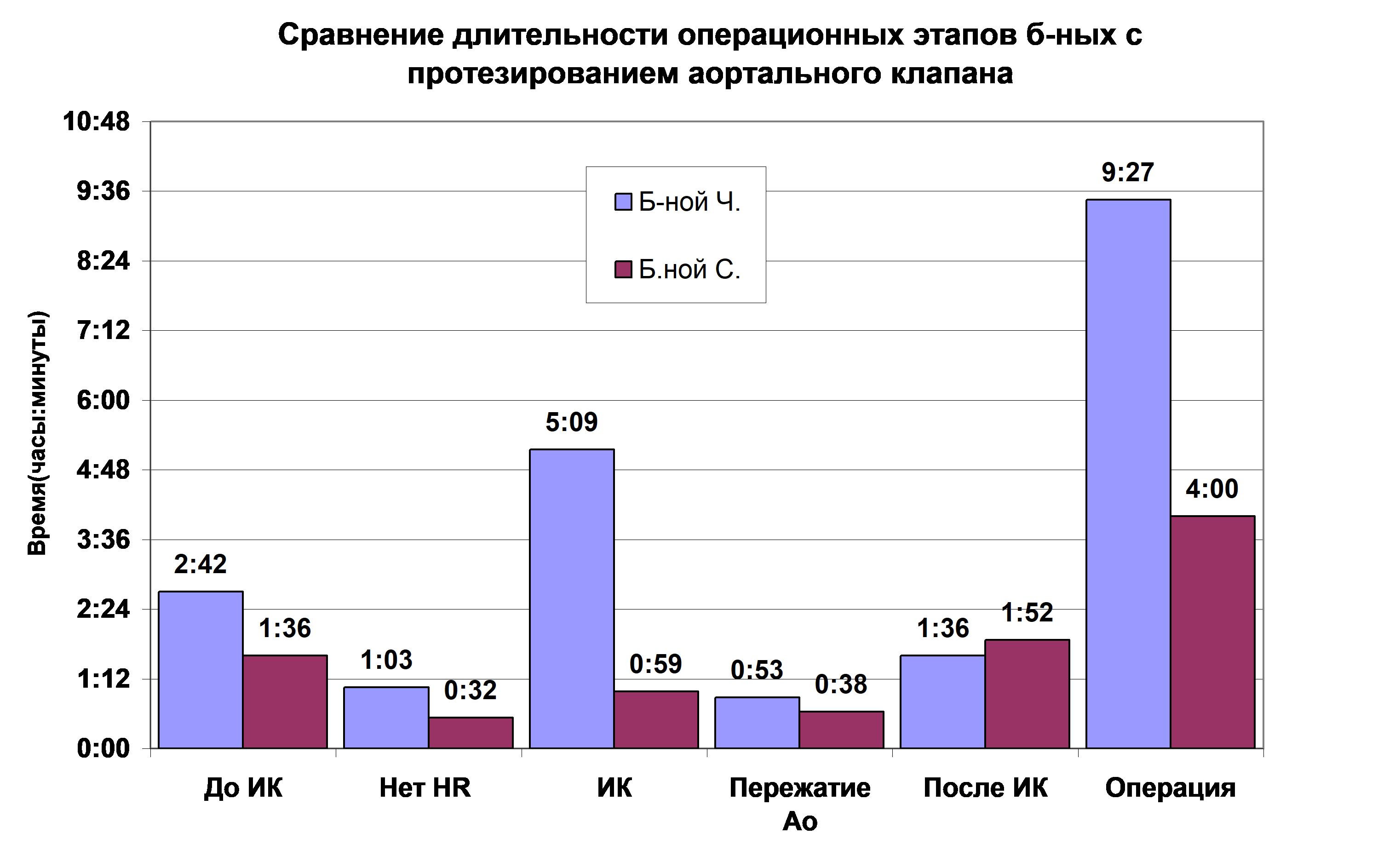 Рис.4. Длительность операционных этапов больных Ч. и С. во время операции протезирования аортального клапана