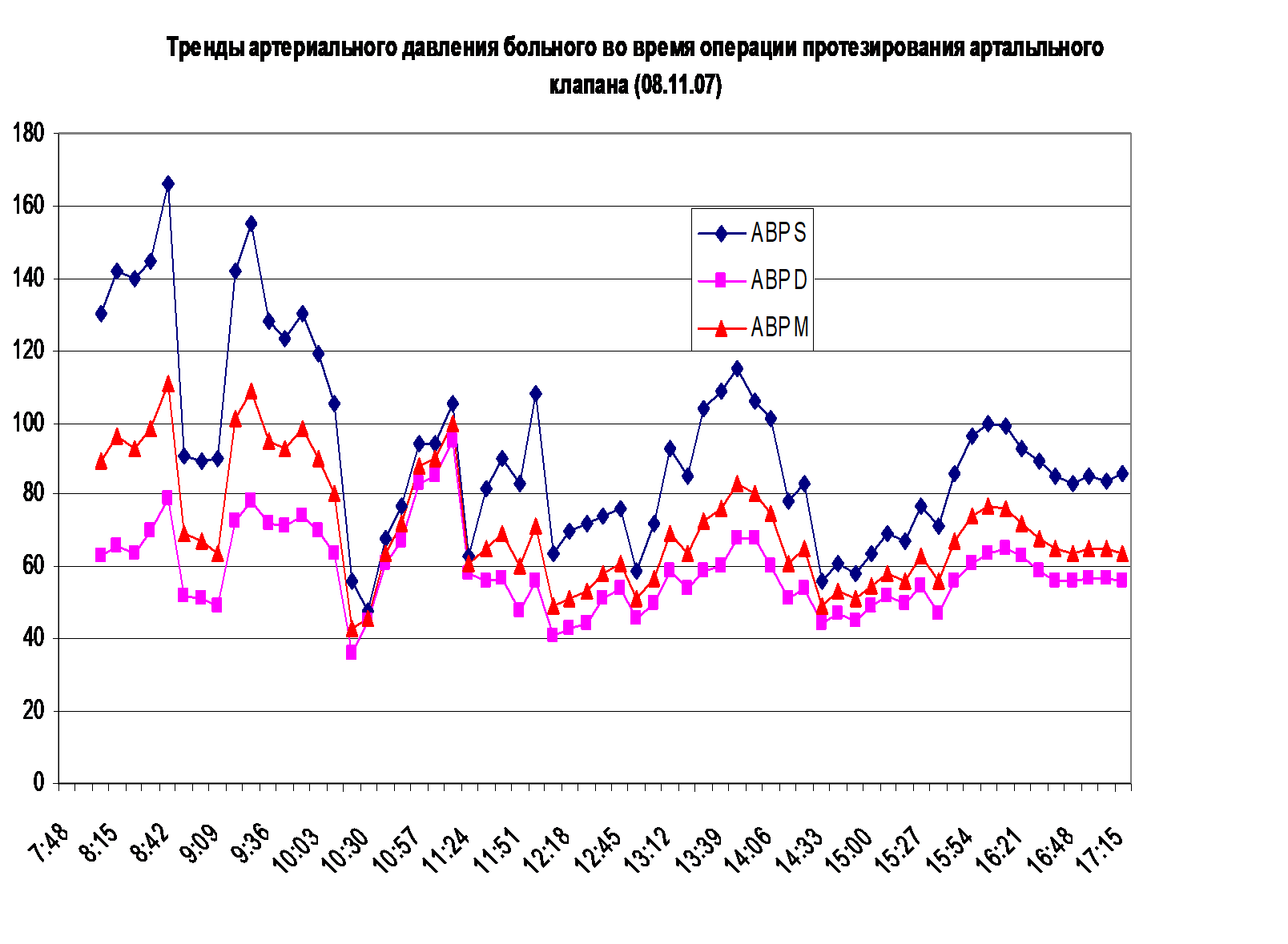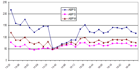 Fig. 5. Trends in systolic (ABP S), diastolic (ABP D), and mean (ABP M) blood pressure during aortic valve replacement surgery in patient Ч.